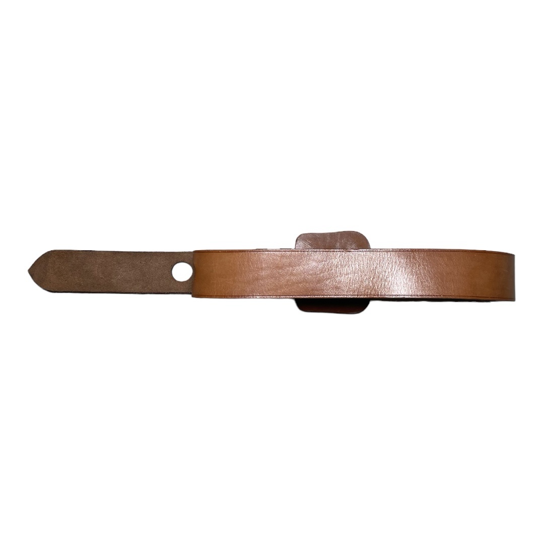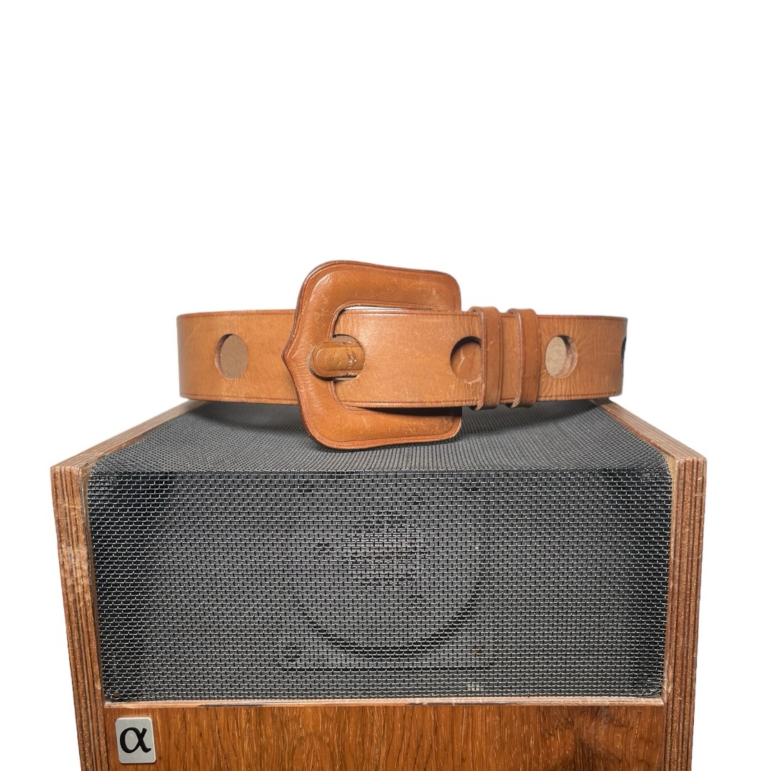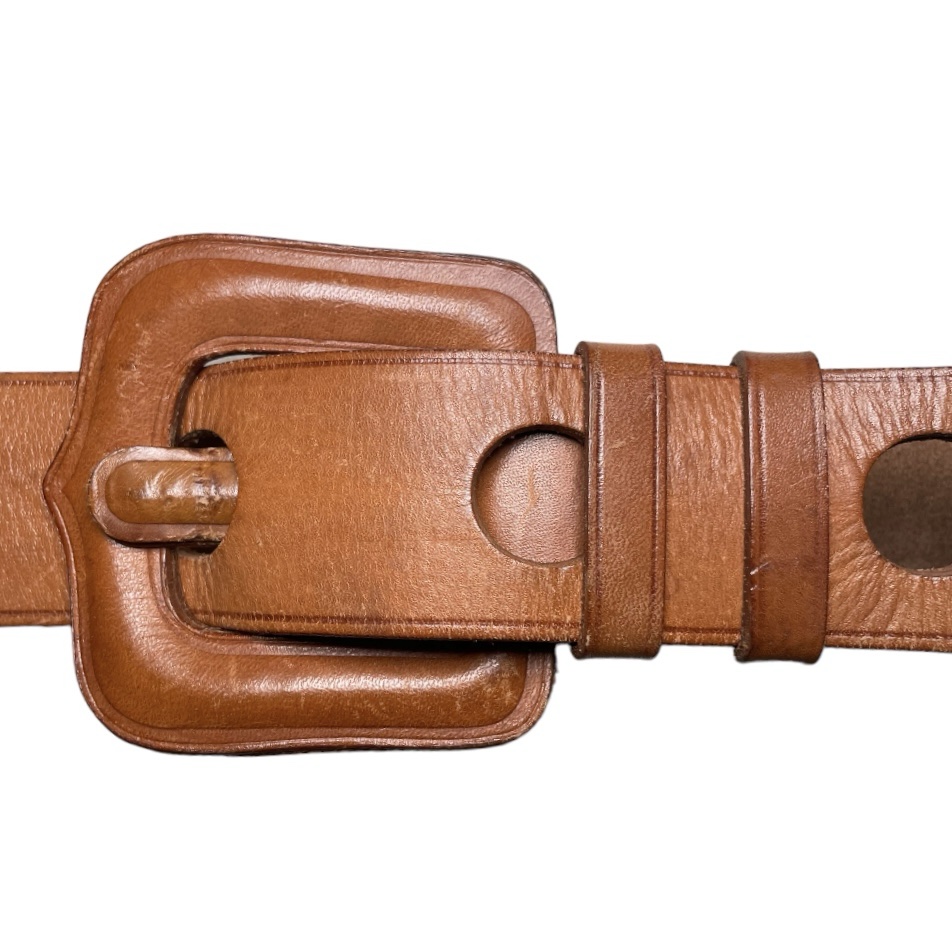DETAILS: Vtg 1970s wide natural leather belt with natural tan. Belt buckle is in leather same as shell and over all look of the belt is a play with proportions.
