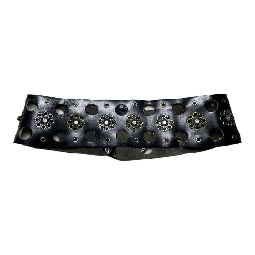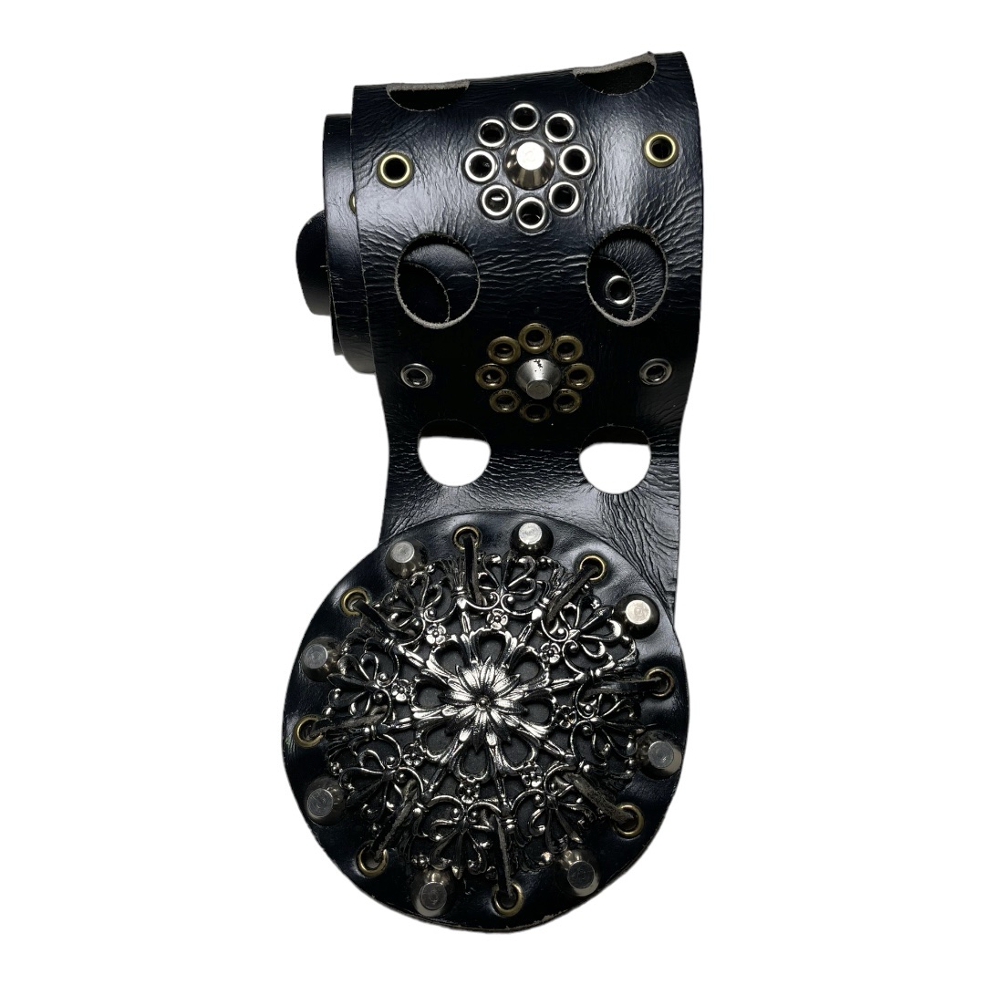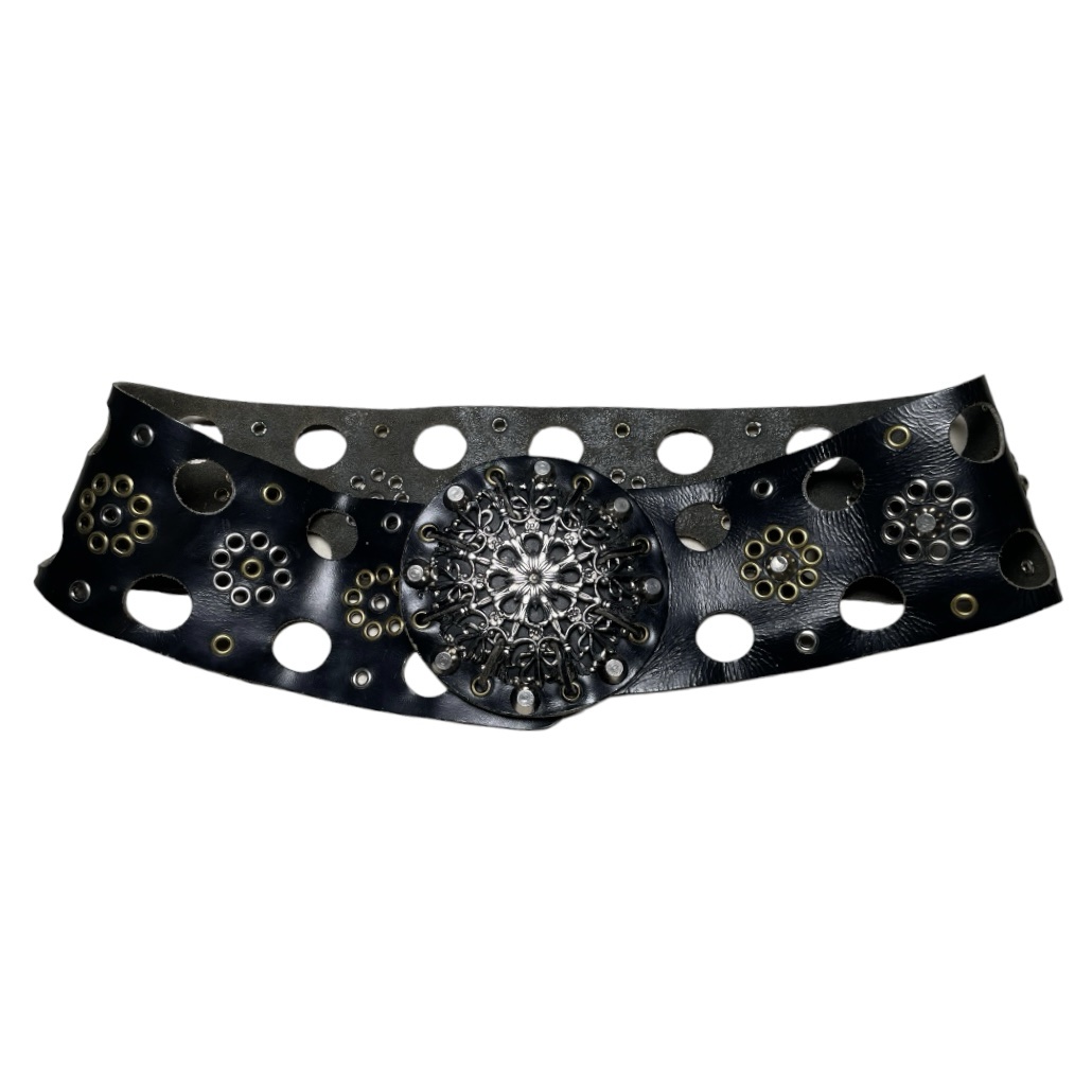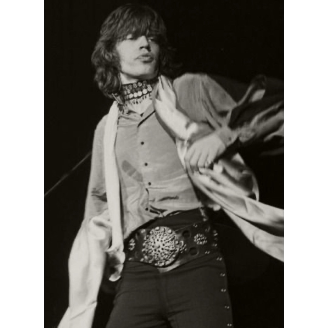 DETAILS: Super Rare one of a kind 1970s genuine leather deco belt with punched deco holes and studded details all around. Centre front is double layered leather in a circle shape with intricate metal decoration. A true rock n roll statement piece and a piece of music history. Mick Jagger himself wore just one like this!