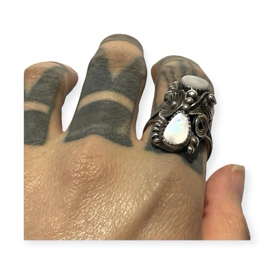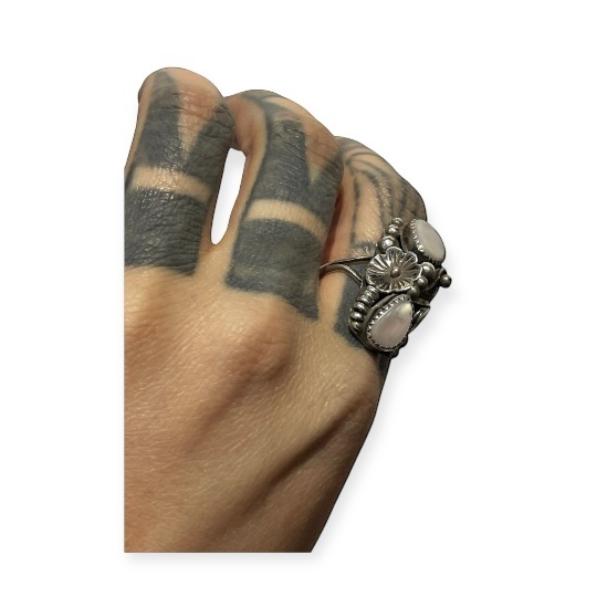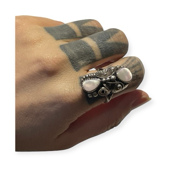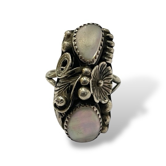 Embrace the beauty of traditional Navajo craftsmanship with this exquisite vintage silver ring, featuring a delicate flower detail at the front and two luminous mother of pearl stones. This timeless piece captures the artistry and heritage of Navajo silversmithing, blending intricate design with the natural elegance of mother of pearl.