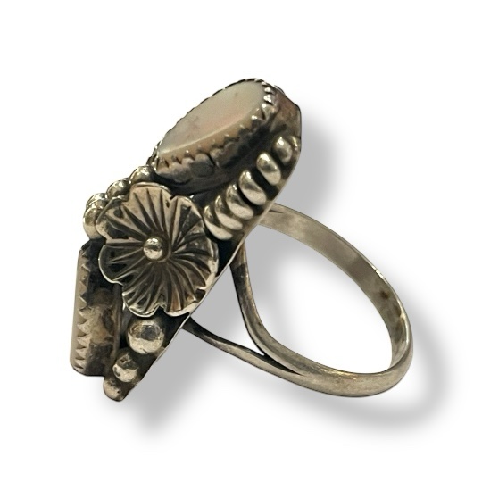 DETAILS: Vintage Navajo Silver Ring – Floral Design with Mother of Pearl